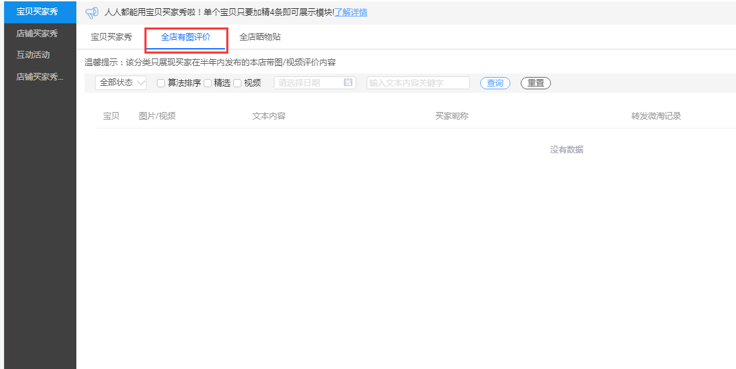 在卖家中心-自运营模块-买家秀里面设置,如果你的店铺有带图的买家秀,在此处可以设置加精。